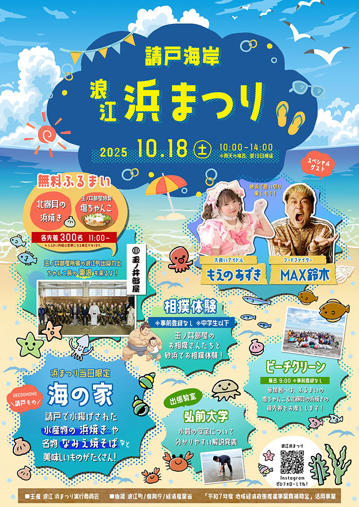 イベントでは、参加者全員で浜辺のビーチクリーン、請戸漁港で水揚げされた北寄貝を含む「浜焼き」、浪江出身の力士による「ちゃんこ鍋」の振舞いを実施します。さらに、浪江町にゆかりのあるインフルエンサーにもイベントに参加していただき、請戸海岸の魅力を再発見し、未来への希望を育むイベントとします。