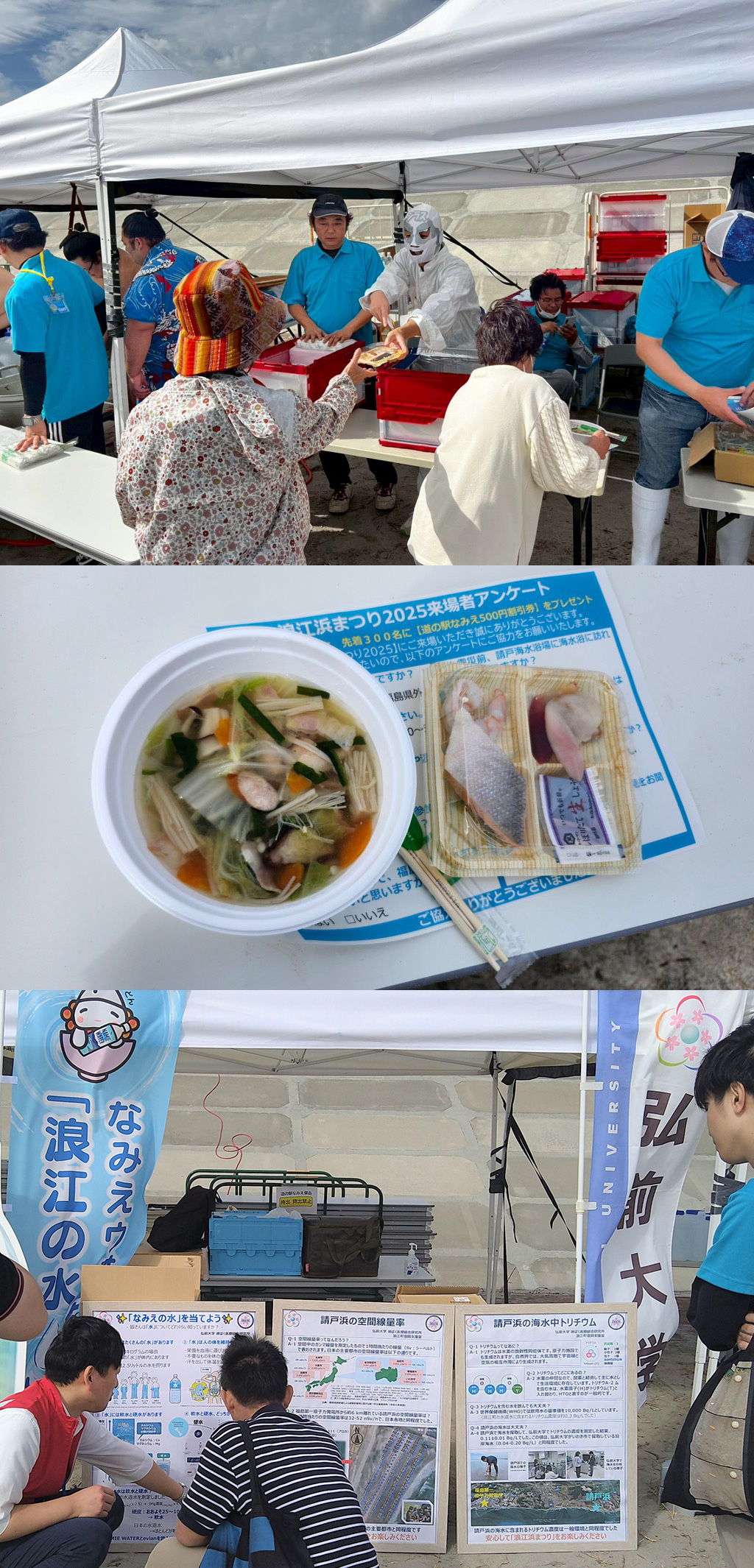 イベントでは、参加者全員で浜辺のビーチクリーンを実施し、浜辺に漂着した様々なゴミを拾いました。また、請戸漁港で水揚げされた北寄貝を含む「浜焼き」、浪江出身の力士である東浪関がちゃんこ長を務める玉ノ井部屋の「ちゃんこ鍋」をそれぞれ限定300食来場者に無料で振舞い、常磐ものと請戸海岸の魅力にふれていただきながら、弘前大学による海岸の放射線測定結果や請戸で採取した海水のトリチウム濃度の測定結果に関する情報を同会場で発信し、来場者の理解を深めるとともに、風評被害の払拭に努めました。さらに、浪江町にゆかりのあるインフルエンサーであるMAX鈴木氏、もえのあずき氏にもイベントに参加していただくなど、およそ3,000人の方にお越しいただき、ひとときの賑わいを取り戻しました。