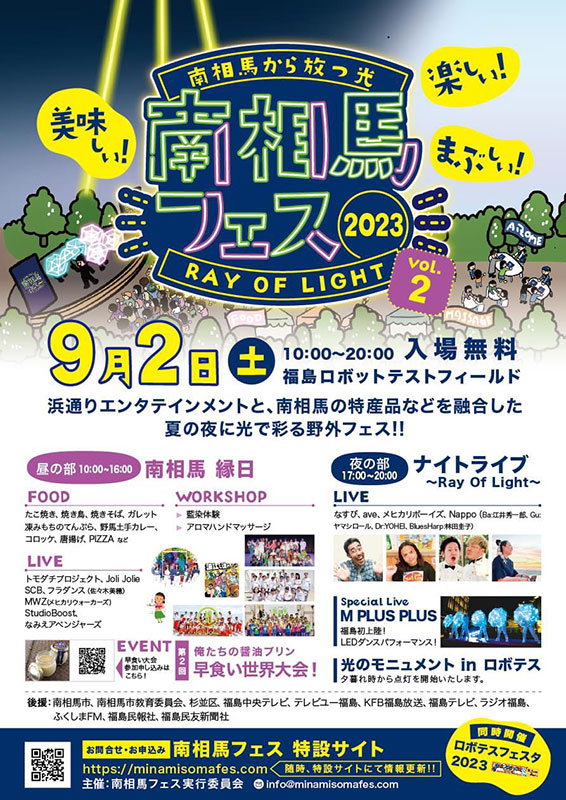 福島・浜通りのエンターテインメントと南相馬の特産品を融合した、地域の魅力を体感できる野外フェス。第2回はロボットテストフィールドとの共催により、デジタルダンスパフォーマーとの共演で、南相馬の可能性を内外に示した。第3回は常磐ものを使った多彩な飲食出店も加わり、より一層地元の力が集結したフェスになりました。